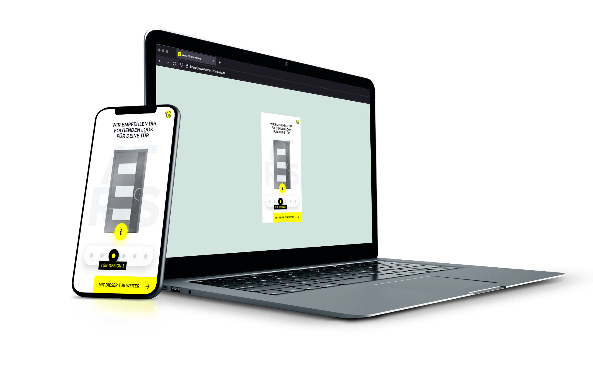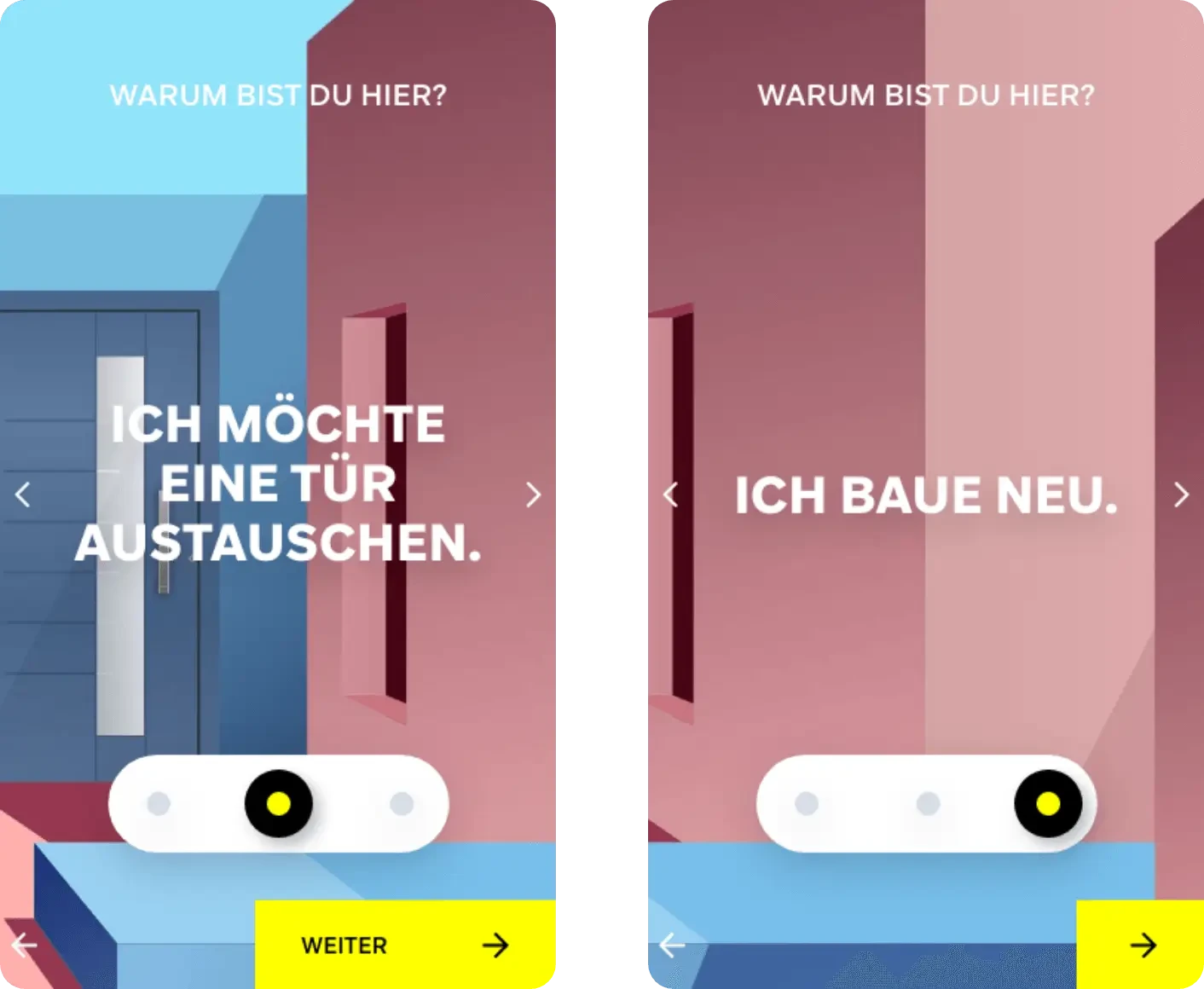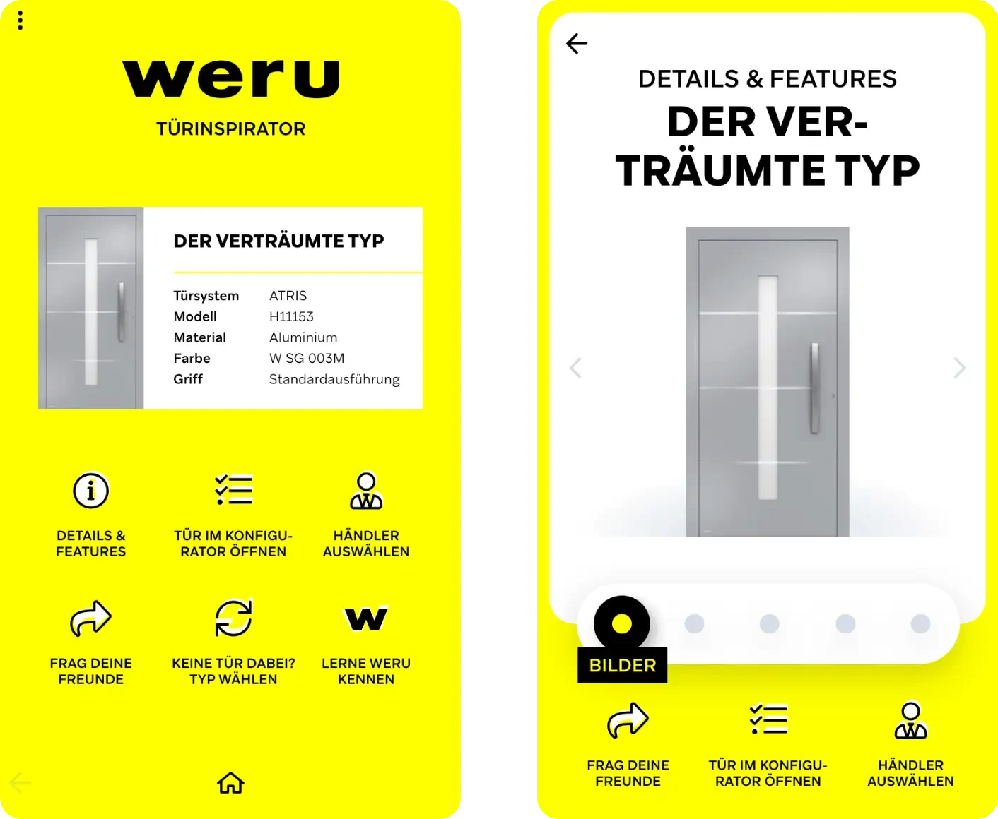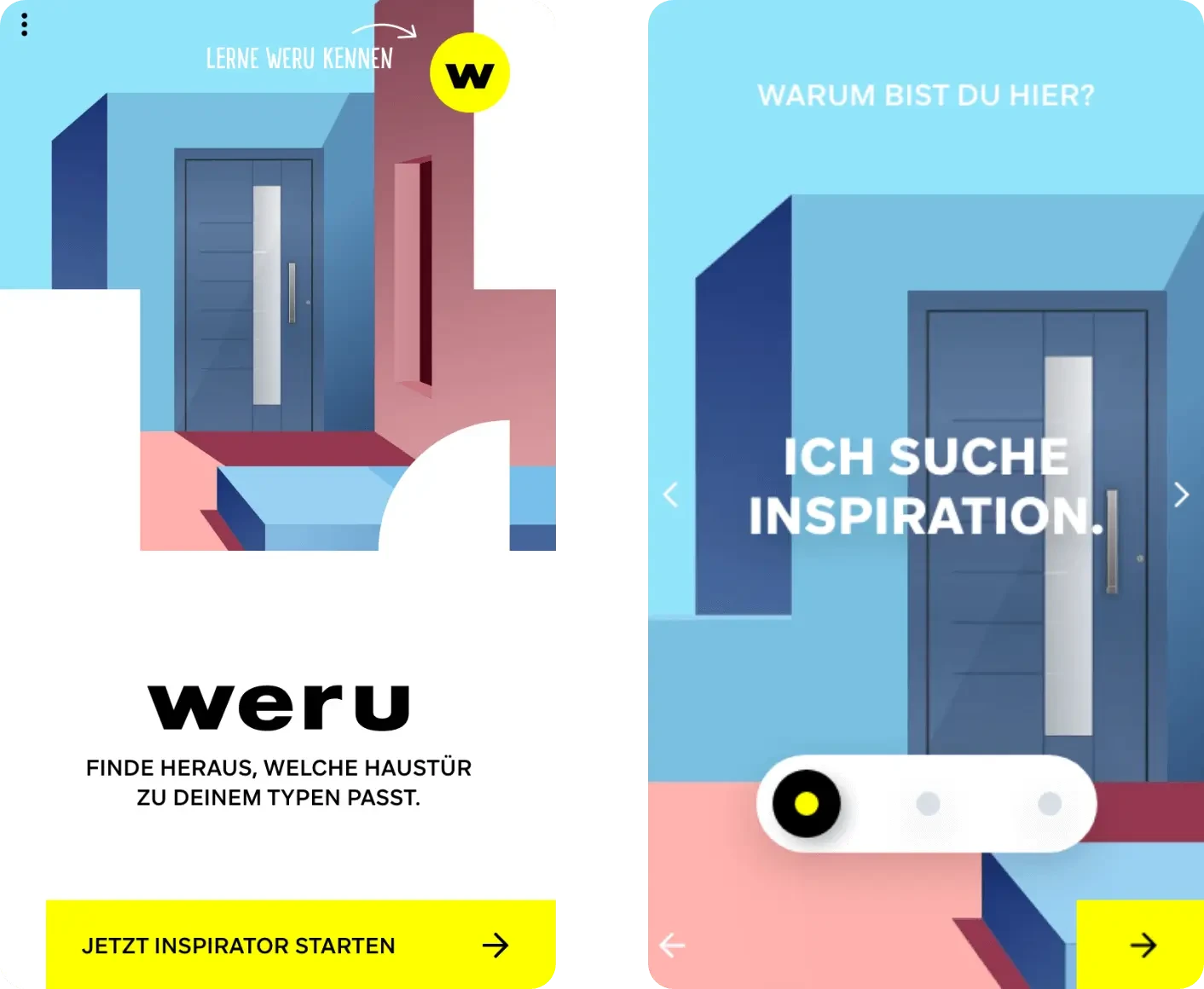 Um Endkunden in der Auswahl passender Türen zu unterstützen, hat WERU einen technischen Tür-Konfigurator im Einsatz. Nutzer können zwischen unterschiedlichen Parametern (Materialien, Designs, Farben etc.) auswählen und auf Basis der konfigurierten Tür einen Preis anfordern. Der Prozess bietet den Nutzern einerseits sehr viele Möglichkeiten, andererseits braucht es einiges an Zeit und konkreter Ideen, um spezifische Ergebnisse zu erzielen. WERU hatte daher die Idee einer spielerischen und inspirativen Variante des Tür-Konfigurators. Nutzer sollten schneller und interaktiver mit dem Produktportfolio in Berührung kommen. Ziel war die Konzeption, Visualisierung und technische Umsetzung eines Konfigurators, der Nutzern einen emotionaleren und vereinfachten Einstieg in die Welt der Türen von WERU ermöglicht.