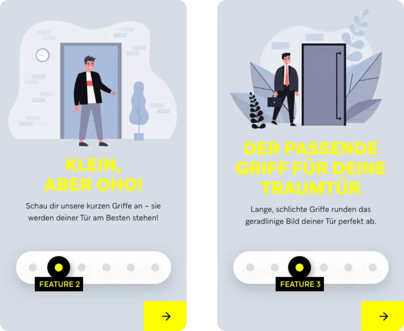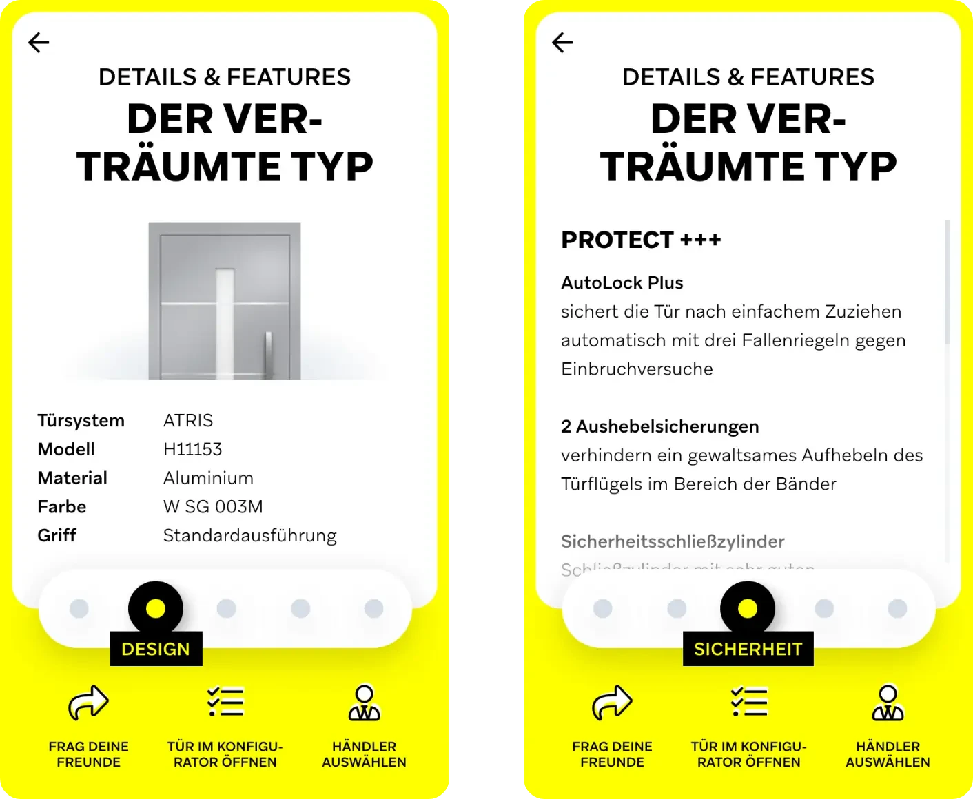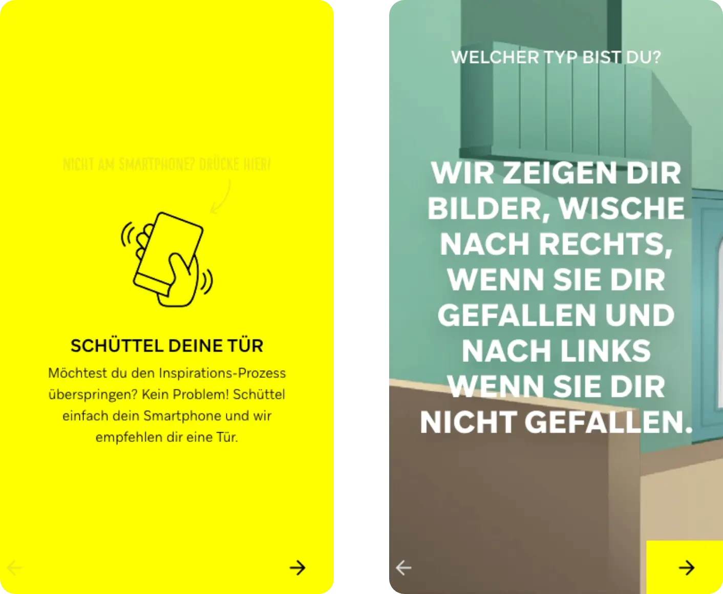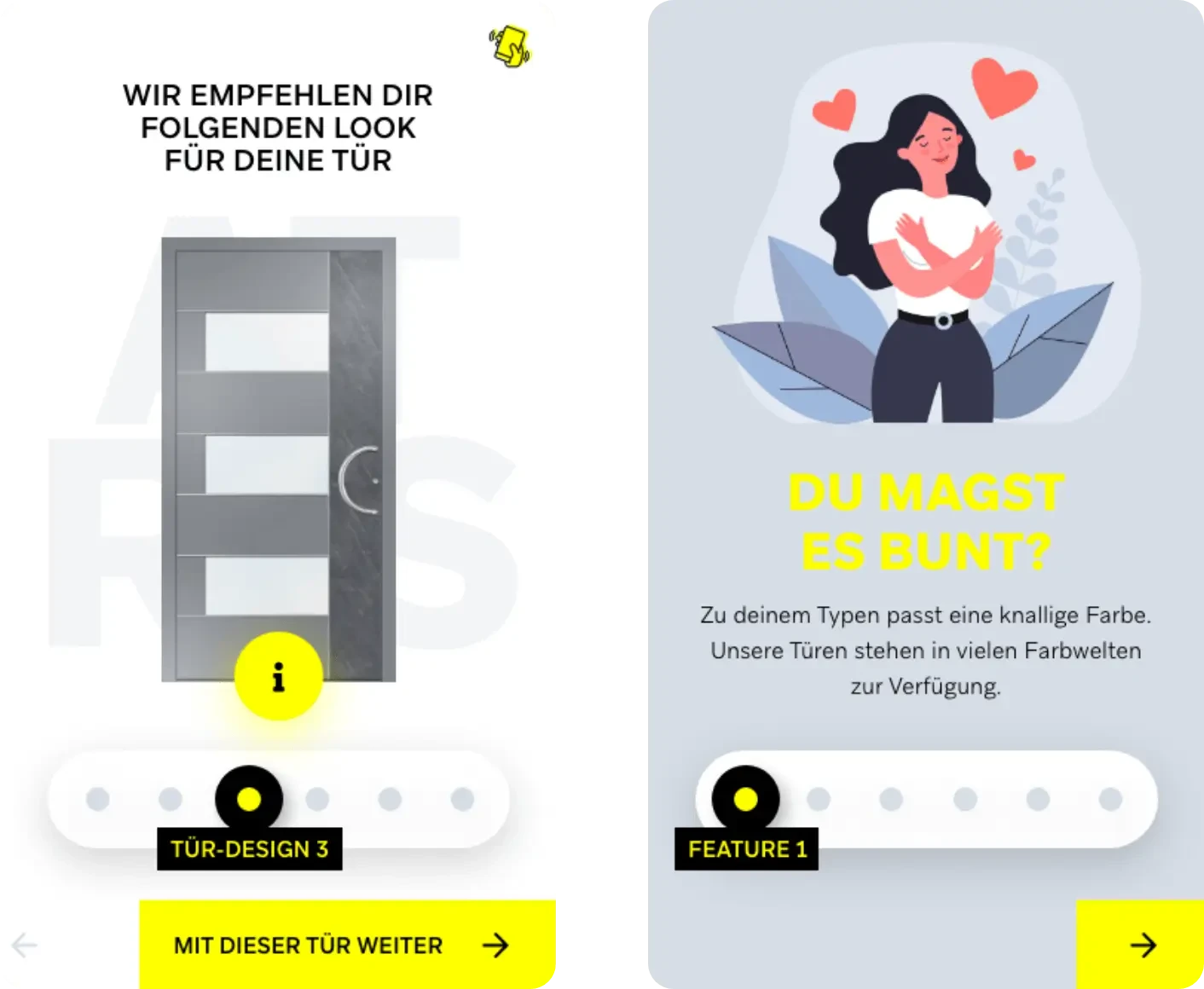 Um die Zielgruppe jüngerer “Casual” Bauherren und Bauherrinnen zu erreichen, lag der Fokus des Konzepts auf dem Thema Inspiration. Es wurde ein bildlastiges und emotionales Konzept erarbeitet. Nutzer sollen einen Prozess durchlaufen, bei denen Wischgesten zum Einsatz kommen, die an Tinder erinnern. Im Hintergrund wird der Nutzer analog seiner Bilder-Auswahl auf unterschiedlichen Skalen eingeordnet. Auf dieser Basis werden ihm am Ende seine Typenbeschreibung angezeigt und dazu passende Türen und Türen-Features vorgeschlagen. Auf Wunsch kann die ausgewählte Tür in den technischen Konfigurator übergeben und weiter konfiguriert werden. Auch können Nutzer ihre Tür und ihren Typen mit ihren Freunden teilen oder einen passenden Händler auswählen. Sollten dem Nutzer die vorgeschlagenen Türen nicht gefallen, hat er die Möglichkeit, sich über die Funktion “Schüttel deine Tür” eine Zufalls-Tür generieren zu lassen. Er findet außerdem einen Überblick über alle Typen und kann sich die dazugehörigen Türen anzeigen lassen.